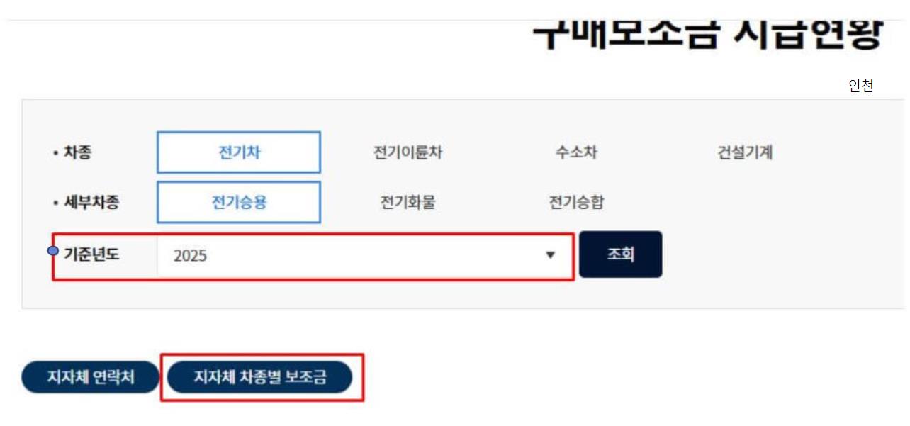 여기서 기준년도를 2025년으로 선택합니다. 그리고 지자체 차종별 보조금 아이콘을 누릅니다.